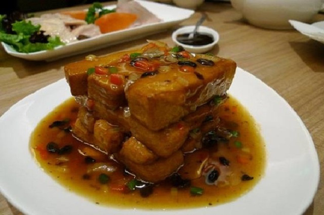 切成長條狀的豆腐油炸後疊起,再淋上韭菜與豆豉及蔥、蘿蔔調製成的醬汁,口味上很有傳統中菜味,豆腐柔嫩,也很好下飯。