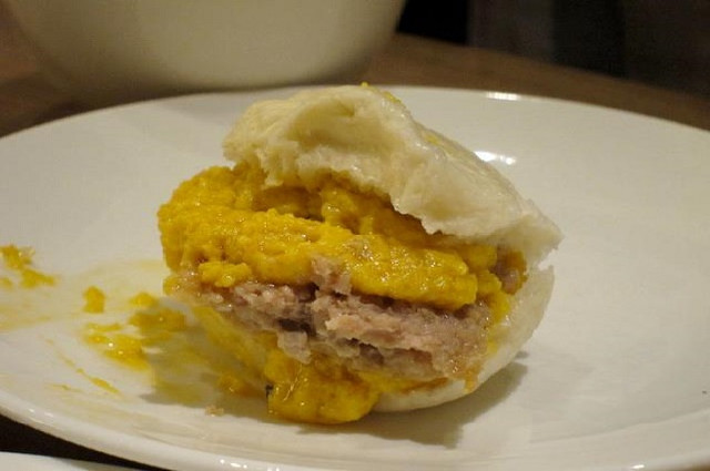 用大湯匙一氣喝成地挖下,好厚實的一層鹹蛋黃,藏在裡頭的肉末,油脂如星光般閃閃發釀著,將蛋黃肉挾進小饅頭裡 ,又沙又鹹又香的滋味撩人不已。