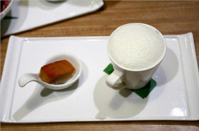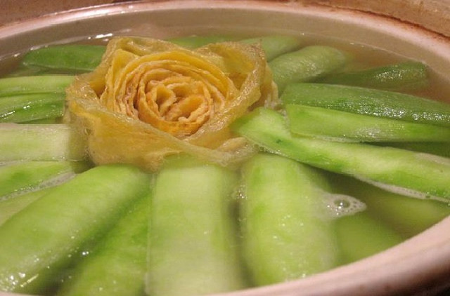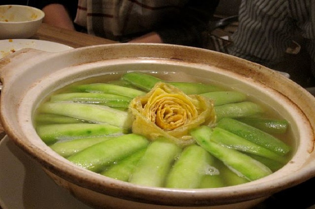 視覺效果滿分的銀杏牡丹鍋,使用蛋皮捲曲成牡丹狀,四週放射出的脆綠絲瓜鋪滿整個湯面,相當令人驚豔。