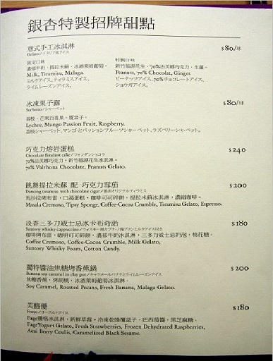 結束了台菜的正餐部份,你以為就這樣結束了嗎?接下來才是重頭戲,銀杏特製的招牌甜點,這時候才知道原來銀杏的甜點師傅來頭不小,且是對甜點有熱情與堅持的少年,曾在紐約知名的NOBU餐廳服務過,NOBU是由美巨星勞勃迪尼諾所投資的和洋餐廳,非常知名,而銀杏的甜點師傅竟來自該名店,立刻讓人感到興奮並充滿了期待,看著菜單的食材介紹,每一個都讓人好想點,可惜大家都沒那麼多肚子可以裝啦!