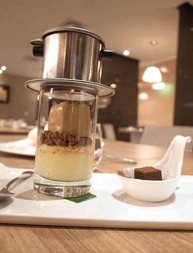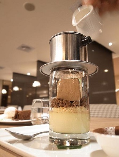 看似越南咖啡的「跳舞提拉米蘇」,以牛奶烤布雷取代提拉米蘇中綿密的口感,再以提拉米蘇冰淇淋增添冰涼的風味,品嘗前必須先用滴漏咖啡的方式,讓濃縮咖 啡濕潤口渴蛋糕,然後在口中組合成美味且獨特的提拉米蘇 ,可可脆餅的加入更增添了奇妙的口感,很棒的一款甜點。