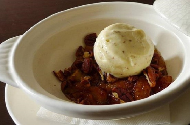 小小的鍋裡有煮得熱滾滾的焦糖香蕉,鋪上烤胡桃,附上冰酒萊姆葡萄手工冰淇淋,冰淇淋也是Weber自己作得義式冰淇淋,小剛非常喜歡他做的冰淇淋,味道真的很棒,將冰淇淋倒進焦糖香蕉鍋裡,焦糖香蕉的熱度讓冰淇淋緩緩化開,多麼美妙的一幕啊!冰酒萊姆葡萄冰淇淋的滋味濃郁又香醇,淡淡的酒香與焦糖香蕉結合在一起,超好吃的說,小剛覺得醬油不會太明顯,只是一點點鹹味,焦糖跟香蕉的甜度早就蓋過了醬油的鹹了,算是一款蠻甜的甜點喔!搭配烘烤過後的核桃,真的相當適合。