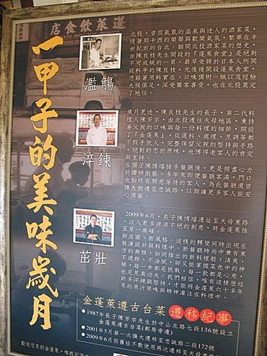 四十年前,陳良枝先生創立的「蓬萊料理」,在當時盛行的北投酒場文化裡,享有極高的評價,不少國內知名企業的創辦人及董事長,例如新光集團的吳火獅先生等,都是當時的座上佳賓。而蓬萊排骨酥、白斬雞、鹽酥蝦、佛跳牆、魷魚螺肉蒜鍋等,更成為北投知名酒家菜的代表。1987年,長子陳芳宗先生,在天母中山北路七段創立了金蓬萊台菜餐廳,不僅延續了陳良枝先生的精髓,為蓬萊料理注入了更多熱誠,一路走來,陳芳宗兢兢業業、事必躬親,為堅守傳統美味,長年駐守廚房,從補貨到煮食,都是由陳芳宗帶領一批廚師親力親為,正是因為這樣的堅持,金蓬萊贏得各界一致的讚譽。